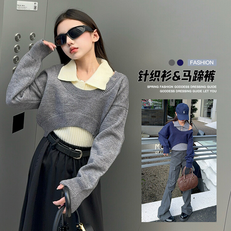 女の子の秋のスーツ2024のファッションの女の子の韓系の中で大きい子供の学院派の偽の2つの色のニットのカーディガン