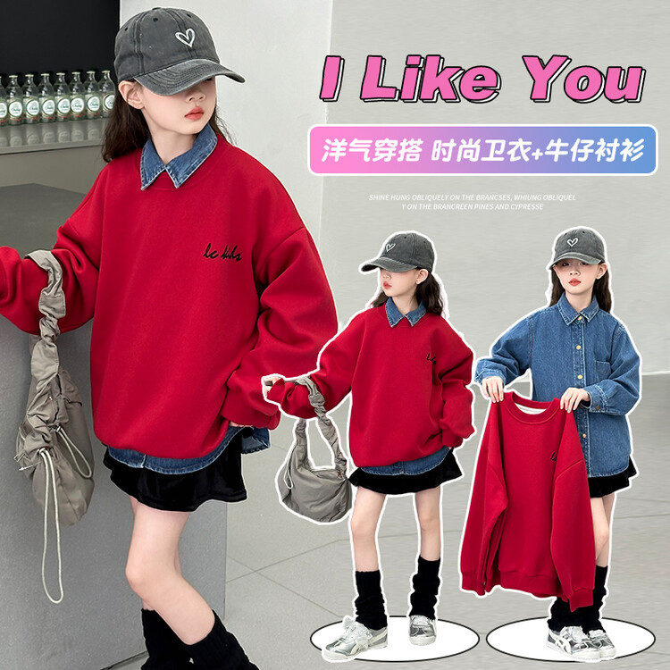 女の子セット秋装2024新型子供アンゴラ赤衛衣カジュアルゆるい流行カウボーイシャツセット