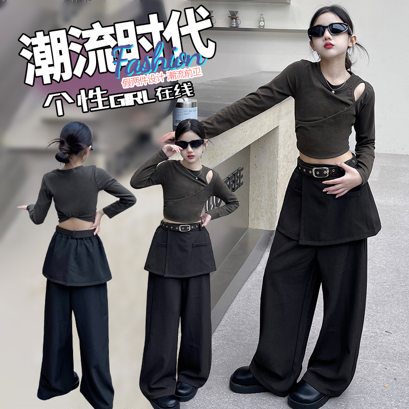 女の子の秋のスーツ2024の新しいファッションの女の子の韓国系の中で大きい子供の洋気のギャルは底の皮のカーテンの広い足のズボンを打ちます。
