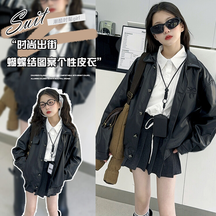 女の子の流行の革のジャケットの2024秋の新型の子供服のカジュアルな洋風の皮の服の中で大きい子供の秋のコートの子供
