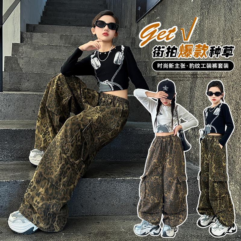 レトロ多ポケット豹紋工装デニムパンツ女の子春と秋の新型ファッション女の子韓国系大童スーツ