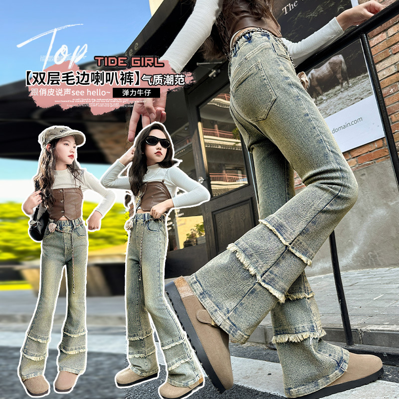 女の子の毛の縁のズボンのトランペットのズボンの秋の2024の新型の子供の小さいラッパの洋風の女性の大きい子供の小さいラッパのデニムのズボン