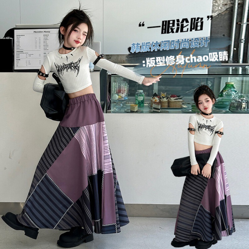 女の子の半身のスカートの春秋の金の2024の新型の子供の流行のゆったりしているスカートの中で大きい子供の高腰の洋風の色のスカート