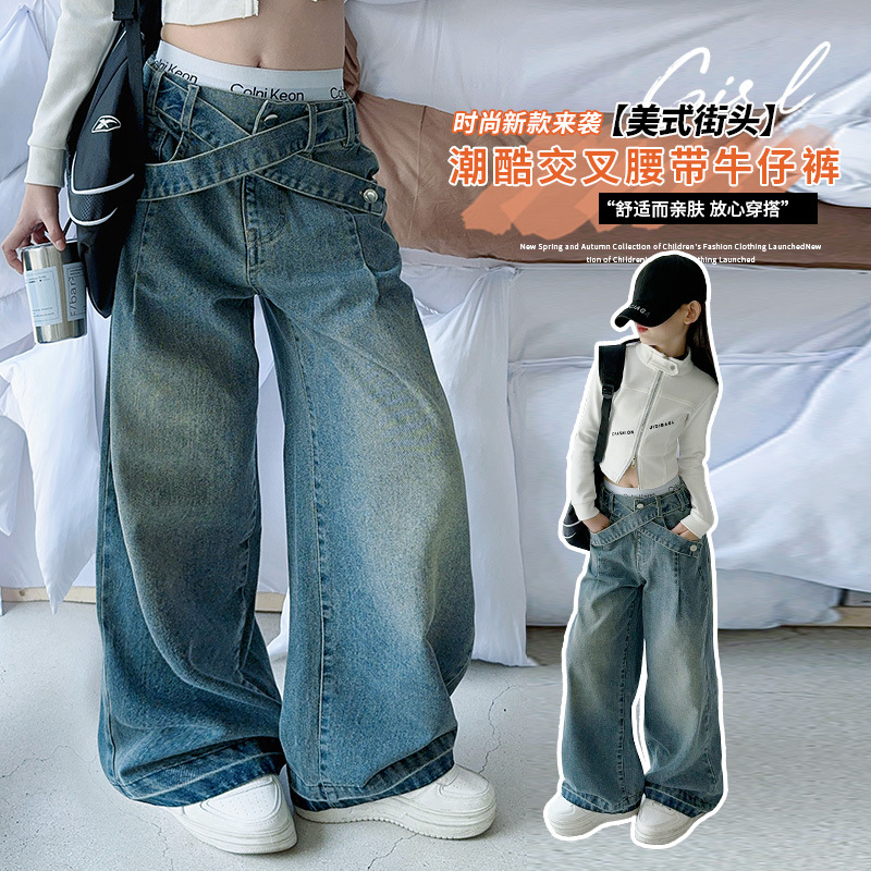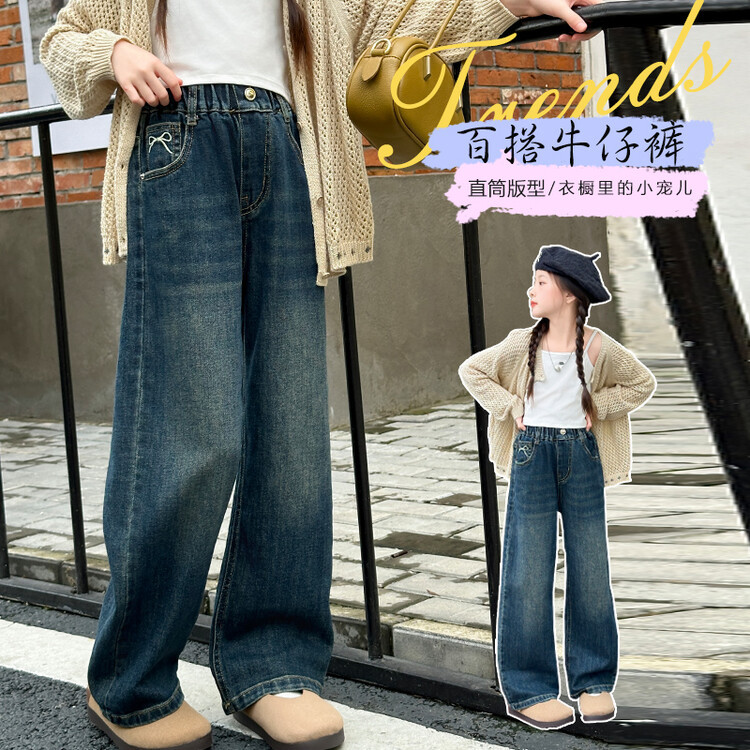 女の子の秋のズボン2024の新しい洋気の大きい子供の秋のジーパンの広い足のズボンの子供の女の子の蝶結びのズボン