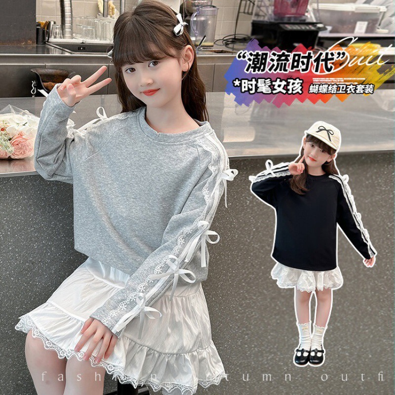 女の子の秋の服のスーツの2024新型のファッションの女の子の韓系の中で大きい子供の洋気の衛衣のスカートの2つのセットは国境を越えます。