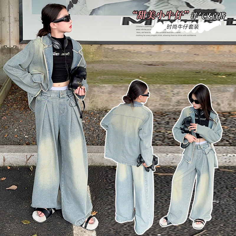 女の子の秋のスーツ2024の新しいファッションの女の子の韓系の中で大きい子供の洋気のゆったりしているスーツのデニムのスーツのファッション