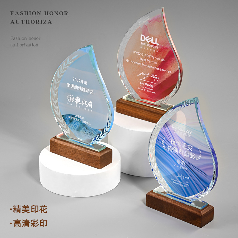 くるみ木の水晶のトロフィーの卸売りは字を彫って色印の優秀な試合の授賞の記念品のメダルを印刷します。