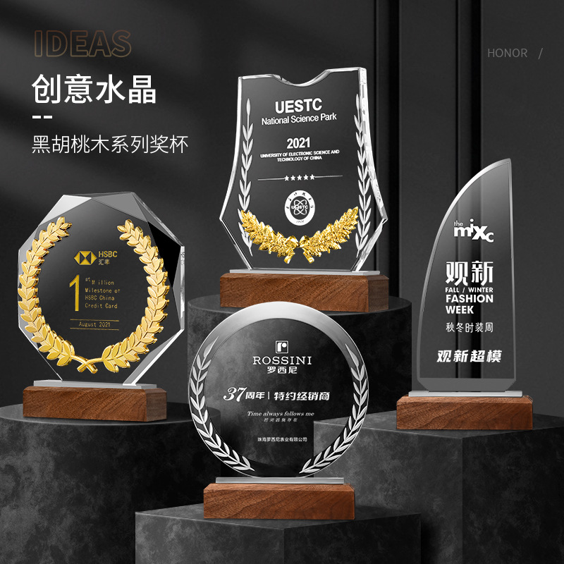高級水晶のトロフィーの卸売りは字を刻んで優秀な従業員の栄誉のメダルの授権の札の胡桃の実木のトロフィーを作ります。