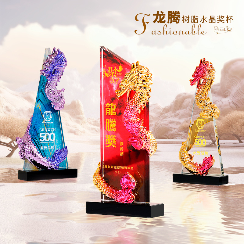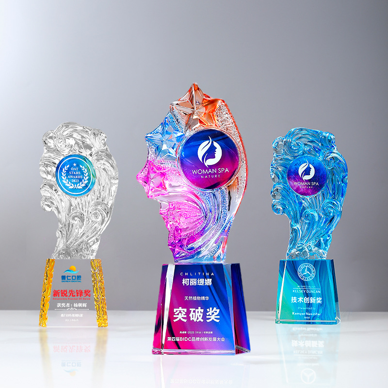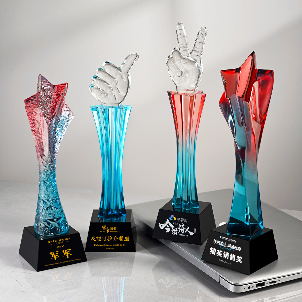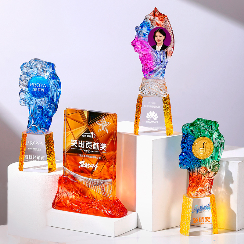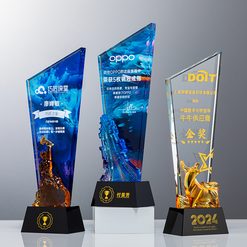 瑠璃トロフィー制作デザイン創意水晶カラー印栄誉退職記念品優秀社員授賞杯卸売り