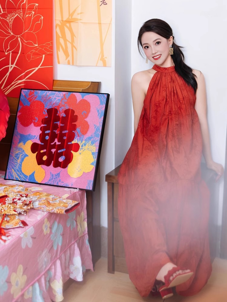 新しい中国風のレトロな中国風のジャカードレッドホルターネックドレス女性の夏の海辺の休暇気質ロングスカート