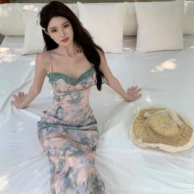 フレンチスタイルの優しいレースの花柄サスペンダースカートサスペンダーサマーニュードレス気質セクシーな痩身ウエストロングスカート