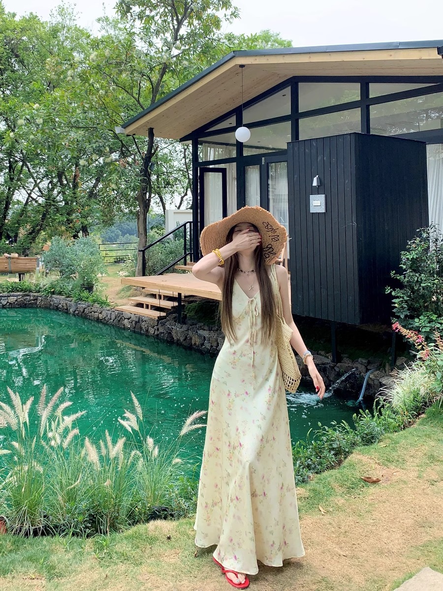 フレンチリゾートスタイルノースリーブVネック花柄ワンピースレディース夏ウエスト痩身Aラインスカート優しいスタイルサスペンダーロングスカート