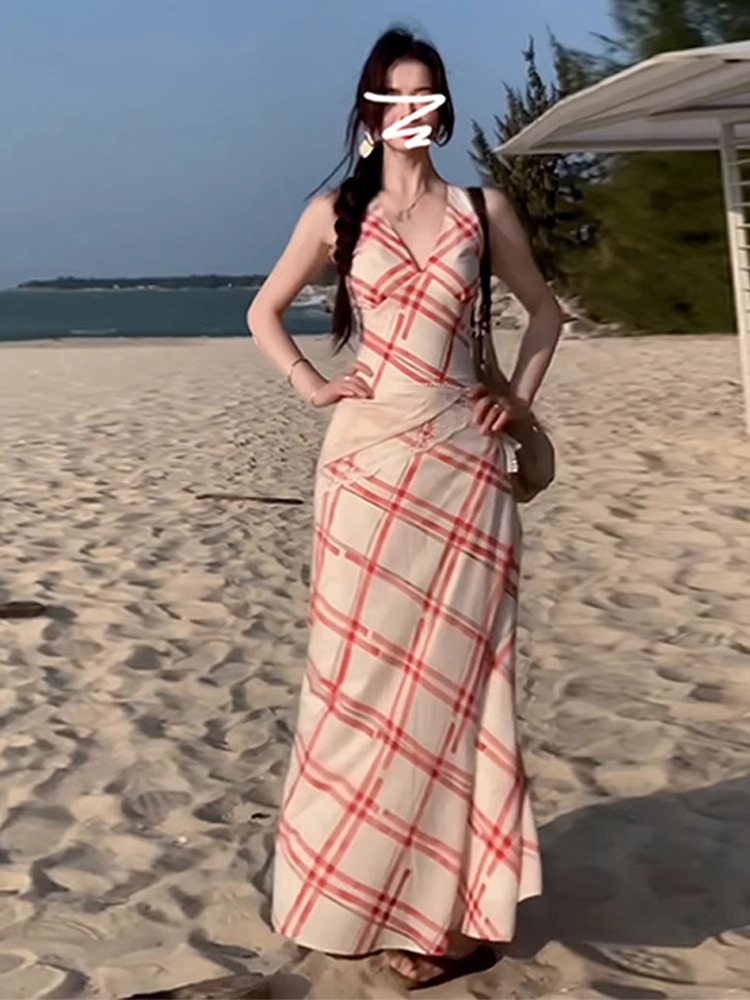 2025年春の新作ホルターネックサスペンダードレス、女性の夏の海辺の休暇気質ピンチウエストハイエンドロングスカート