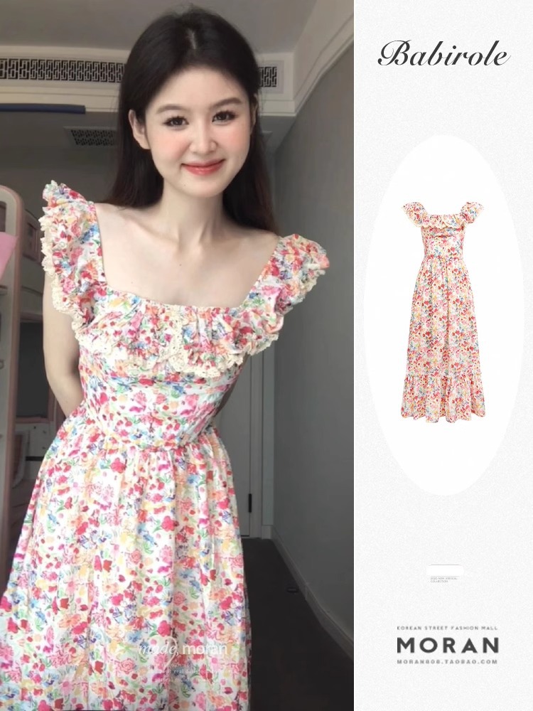 海辺での休暇の気質のドレス、夏のフレンチスタイル、優しくシック、小さなフライングスリーブ、花柄の妖精のドレス、ウエストを細くする