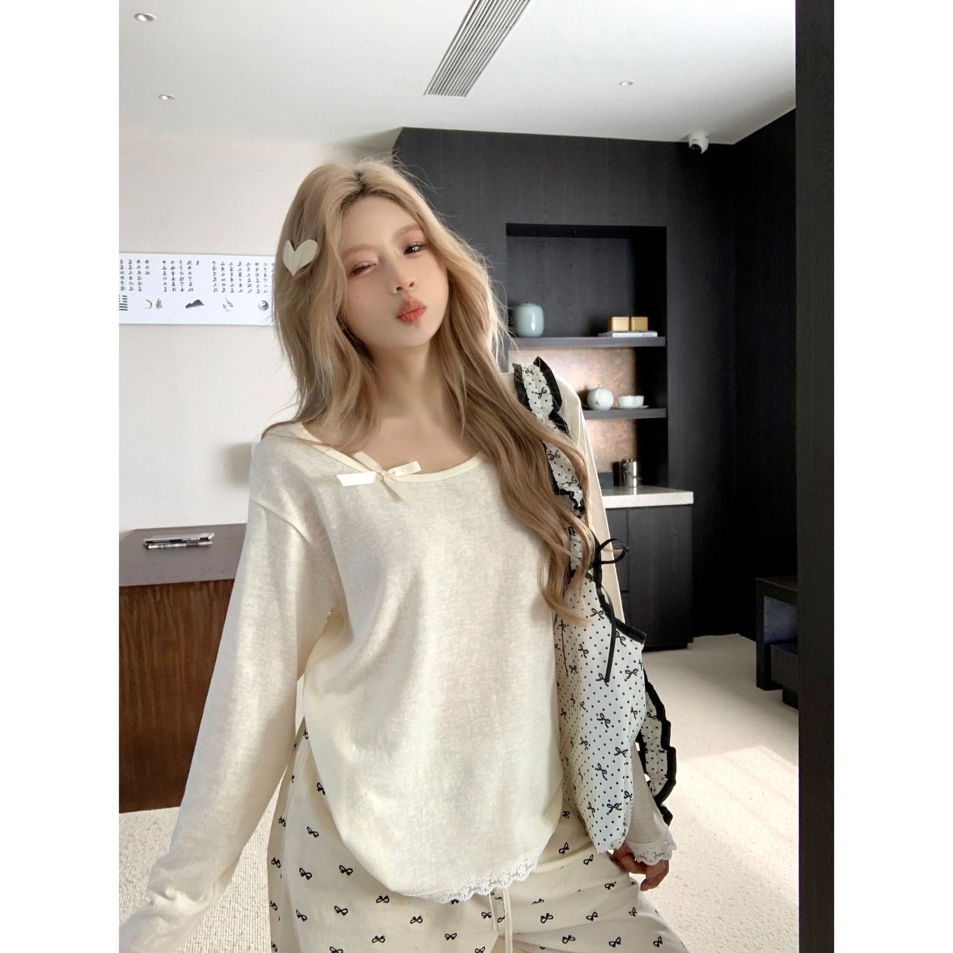 MR【亜麻綿オリジナル生地】リボンレースは白いtシャツの女性秋の甘いブラウスの女性をつなぎます。