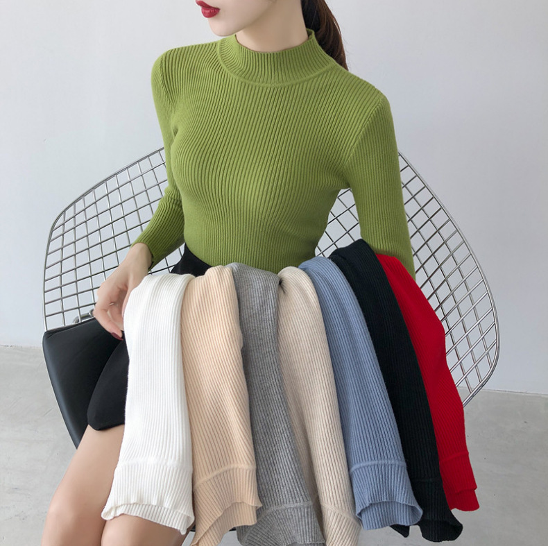 秋冬の新型の芯の糸の中に底のシャツの女性の修身のセーターの半分の高襟の長袖の小さいニットは百合保温します。