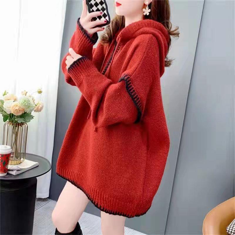 大きいサイズの韓国風デザイン感のあるセーター女性の中長の秋冬の新型のゆったりしたファスナーと帽子のウールのニットのコート