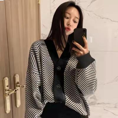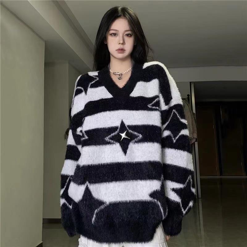 韓国のデザイン感vネックの柔らかいモチモチとした星のストライプが色のプルオーバーのセーターにぶつかります。