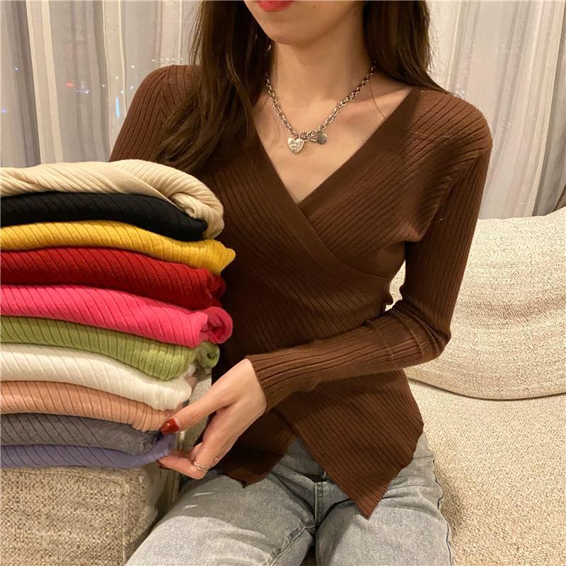 秋冬の新型の芯の糸を包んで身を修めるセーターの交差vネックの底のシャツの不規則な長袖のメリヤスの上着の女性はやせています。