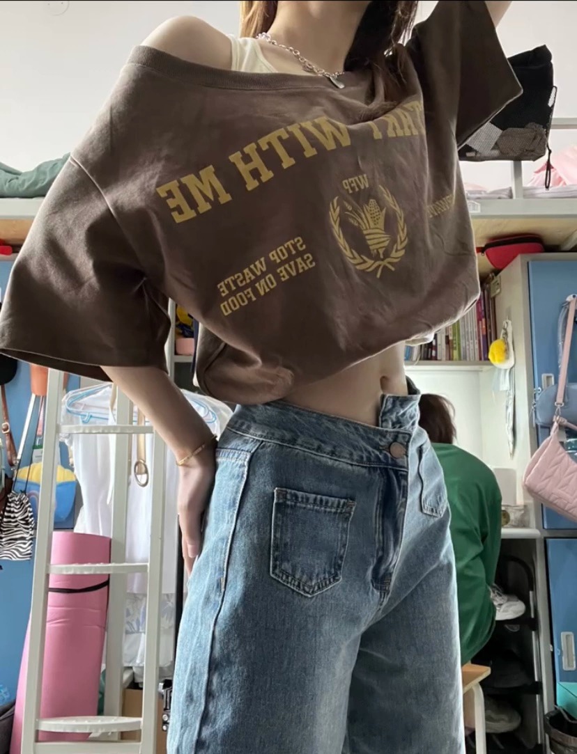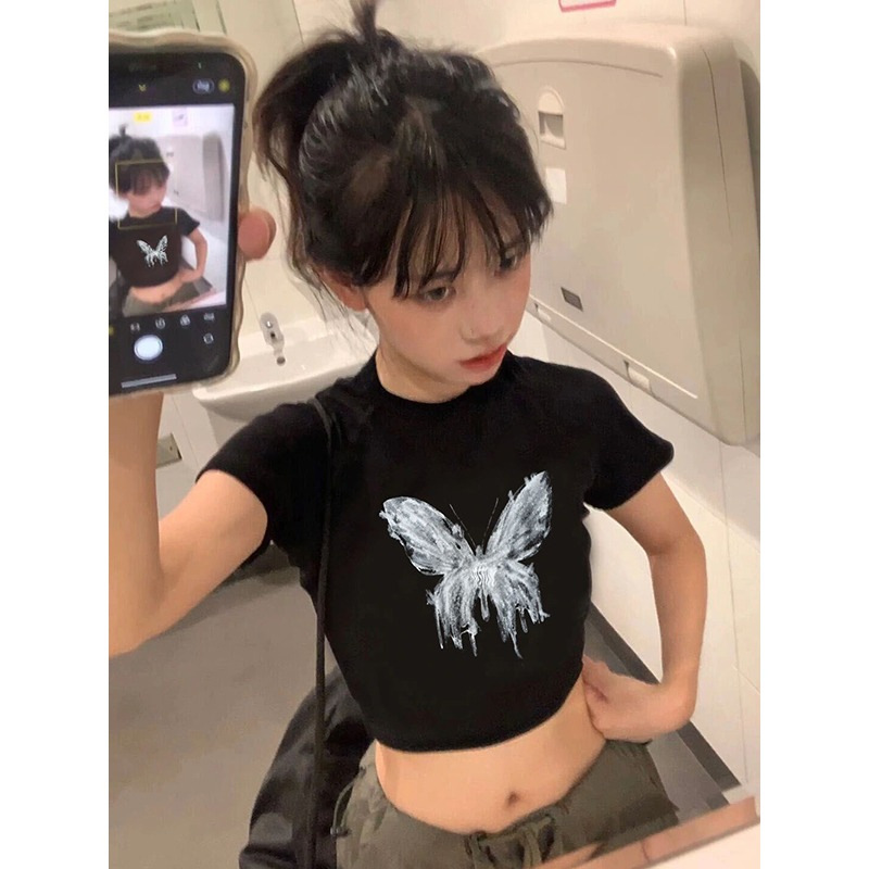 純綿の新型の甘いギャルのプリントの短いタイプの修身tシャツの女性の肩はやせている半袖の丸首を現して学生の上着に似合います。