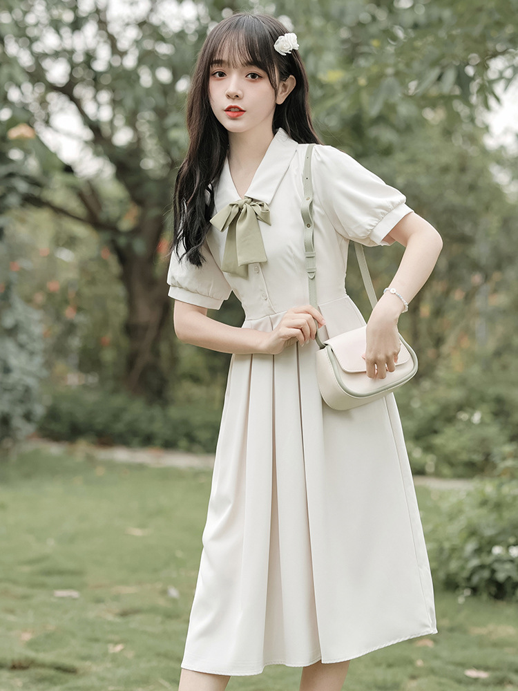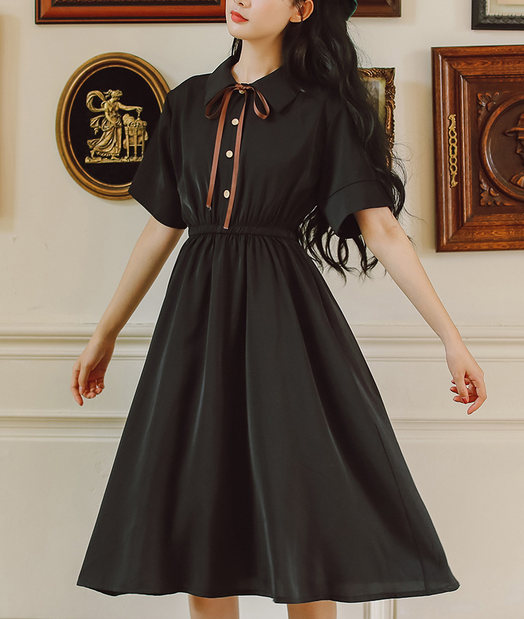 2023夏の新型polo襟は腰の小さい半袖のワンピースの女性の蝶結びの教育の面接の中で長いスカートを収めます。