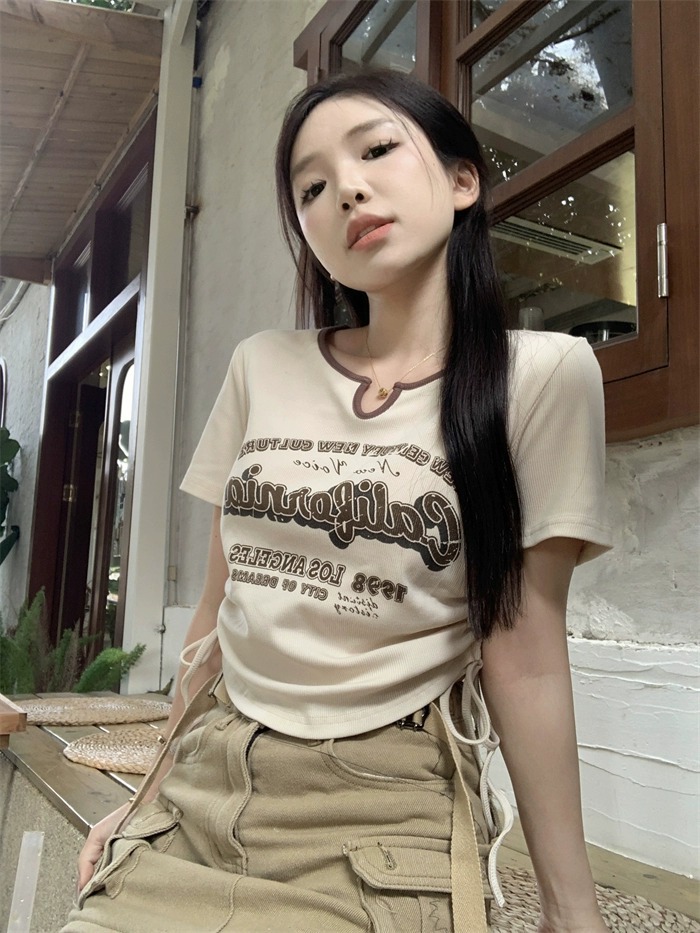 アルファベットの紐引きプリントtシャツ夏の半袖の女装の新型の修身ギャルの小さい衆の底のシャツの短い上着の女性