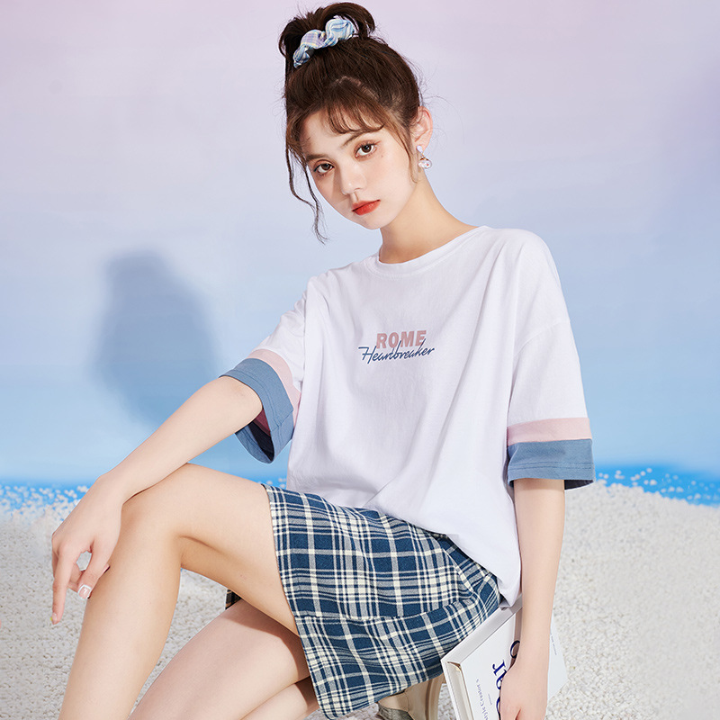 2023夏の新型の色合わせ半袖tシャツ女子学生のゆったりとした肩のアルファベットがプリントの上着をつなぎ合わせています。