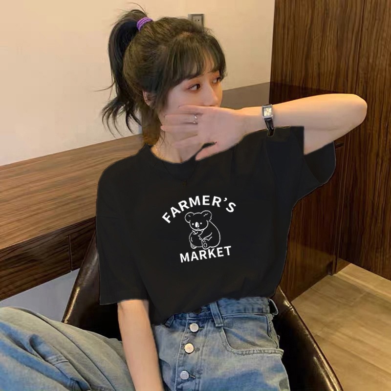 純綿の夏の新型韓国版はゆったりしていて、やせている半袖のtシャツの女子学生は簡単で、プリントの丸首の上着のファッションを合わせます。