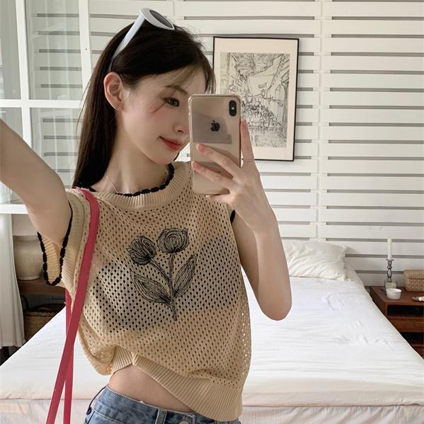 デザイン感のある大衆透視透かし編みベスト女性秋の新型洋気復古花の短いベスト上着