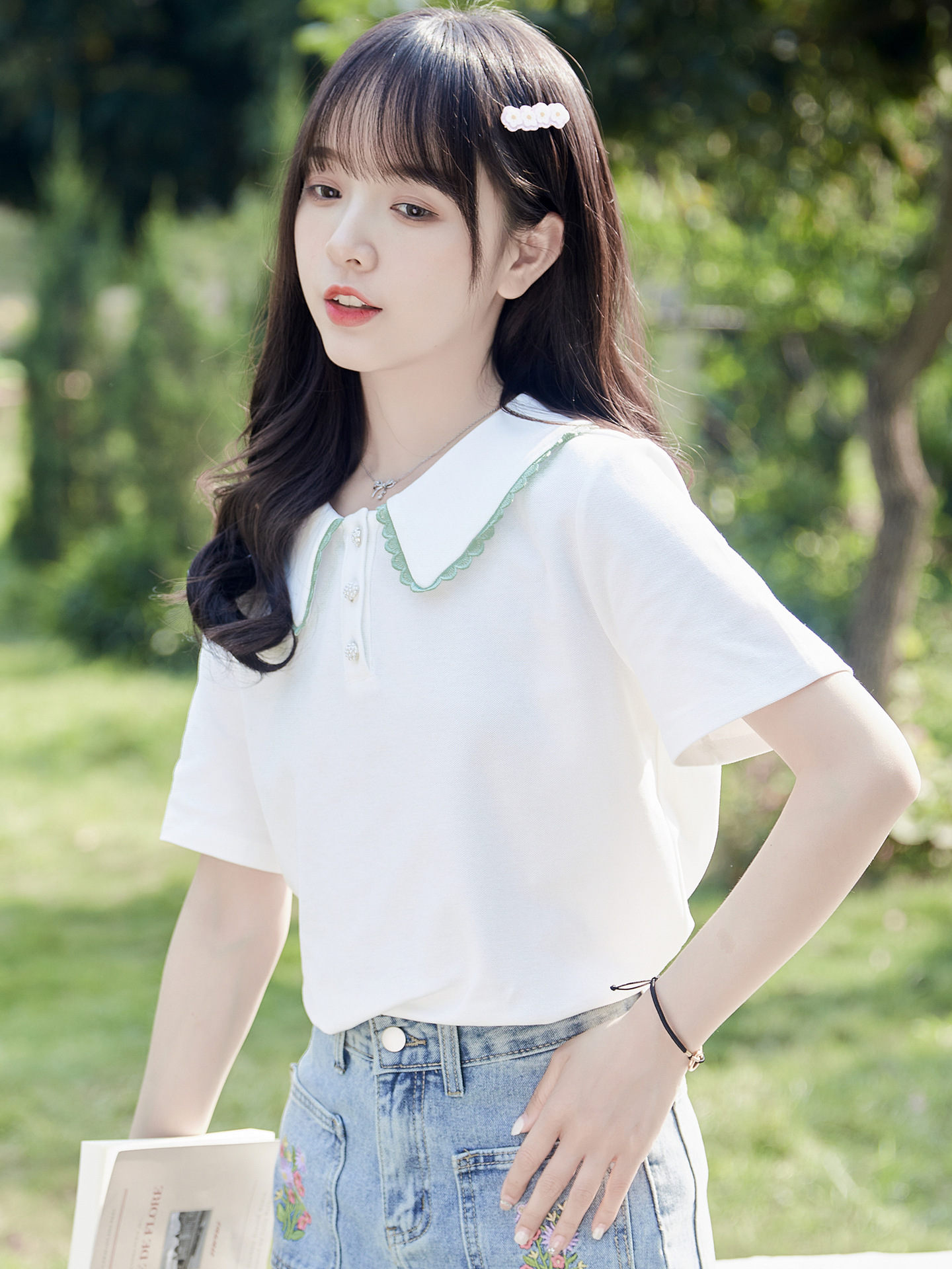 夏の新型の肩の小さい学生の半袖poloシャツの女性のゆったりしたレースの上着の純色の百合tシャツのファッション