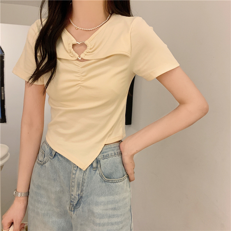 夏の新型はやせている半袖の上着の女性のデザイン感が色の不規則な純色の短いtシャツの女性の丸首にぶつかります。