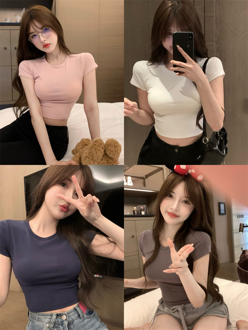 夏の新型の純欲風がやせているtシャツの女性は色の丸首を打って臍のギャルを露出して短い半袖のギャルの上着を修理します。