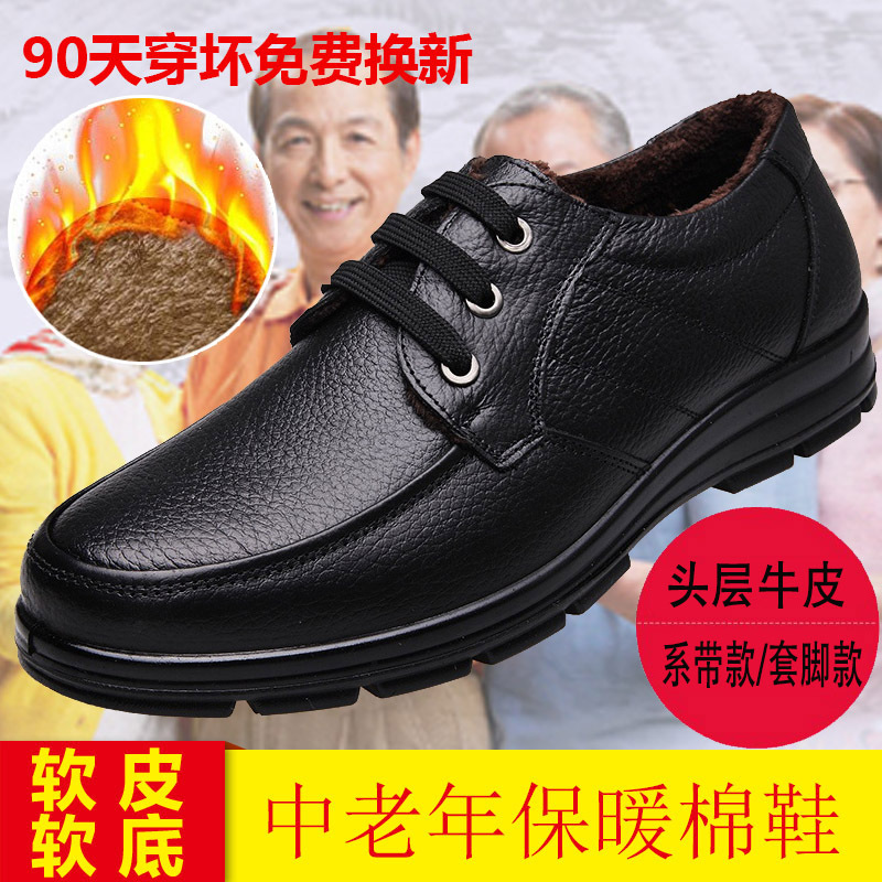 冬の保温男性靴ストラップ2023新型綿革靴ビジネスカジュアル真皮ベルベット靴中高年お父さん靴