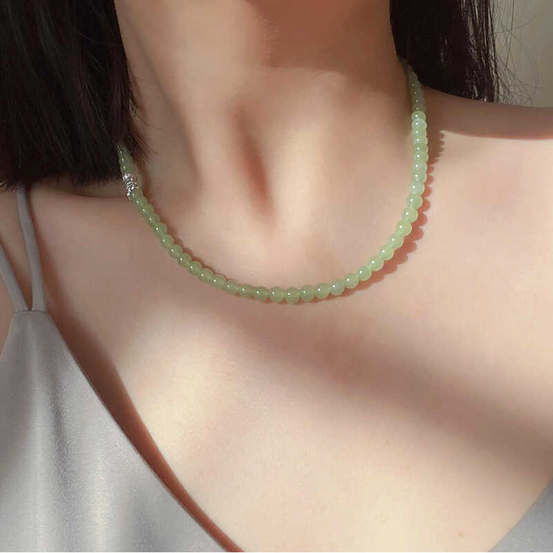 オリジナルデザインの天然新疆ホータン翡翠晴水素材キビビーズネックレス高炭素ダイヤモンドスターリングシルバークラスプ新中国風美白
