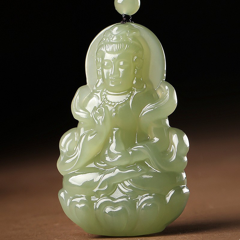 天然翡翠和田玉観音ペンダント メンズ 両面彫刻 蓮の上に座る観音玉ペンダント