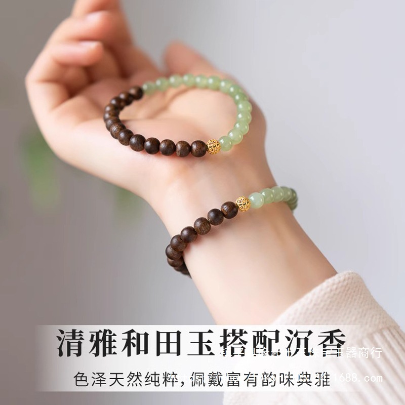 ブルネイ沈香手串女性金天然和田青白玉転運珠木製玉半山半水国風ブレスレット