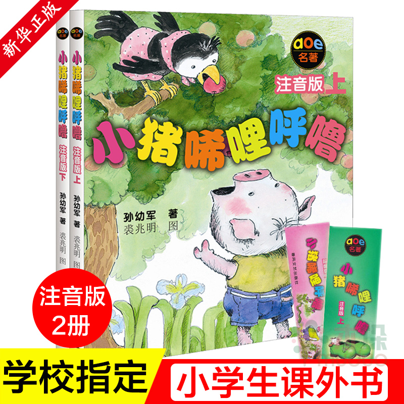 子豚がいびきをかいて音をつけている版の上で2冊の正規の1年生の小学生が課外の本を読んでいます。