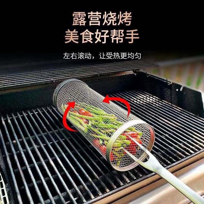 屋外キャンプ用バーベキュー必須回転式バーベキューケージbbqポータブルステンレスバーベキューローリングケージ円筒状