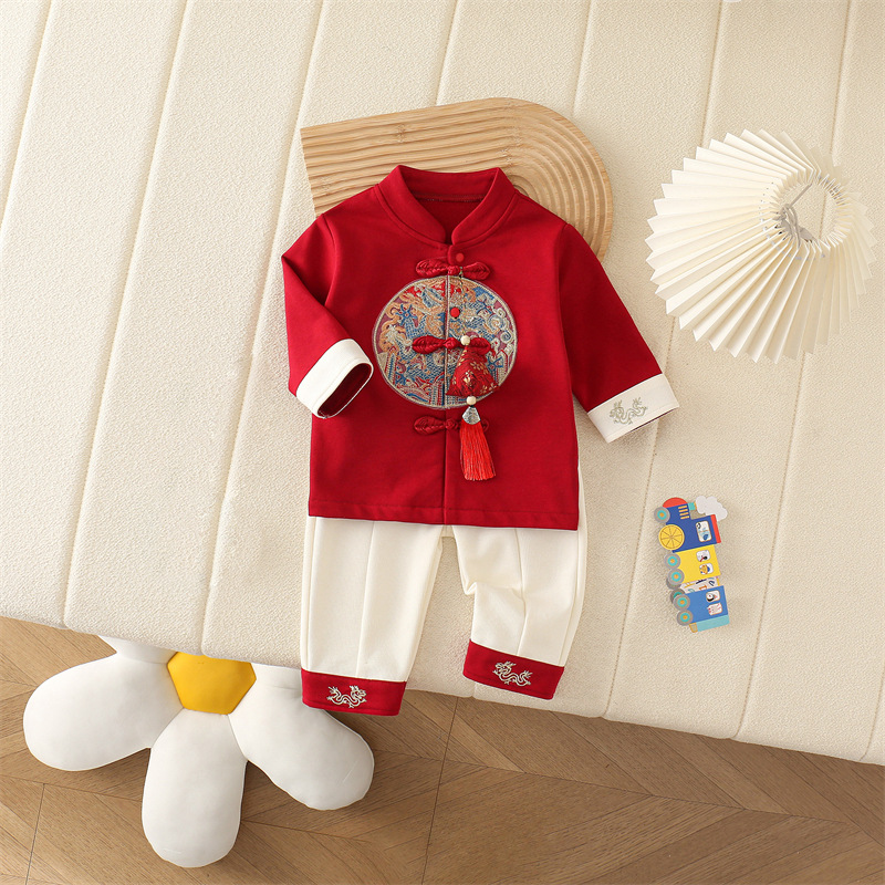 赤ちゃんの春のコートの服の女性の赤ちゃんの中国風の赤いお祝いの分体の2つのセットの満月の外出のドレス