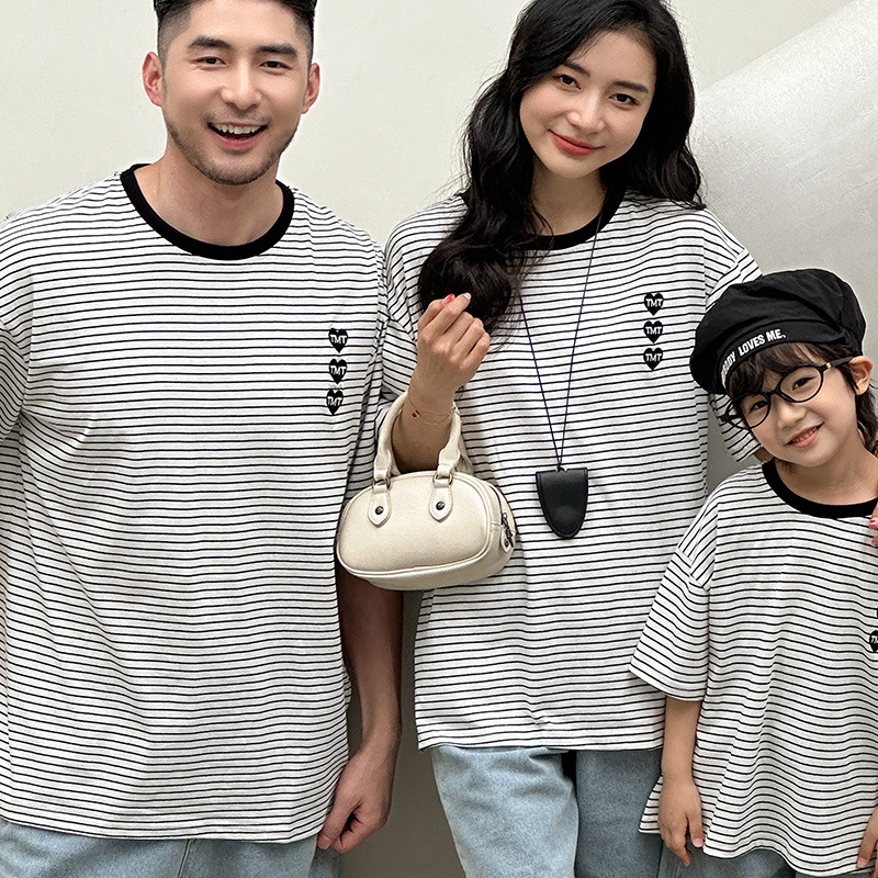 韓国の子供服の愛のストライプの半袖のtシャツの親子服の一家の3つの4口の洋風の上着の中で子供が多いです。