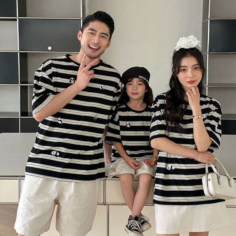 子供用半袖tシャツ親子服2025新作夏韓国版刺繍パンダ上着一家三口ストライプシャツ