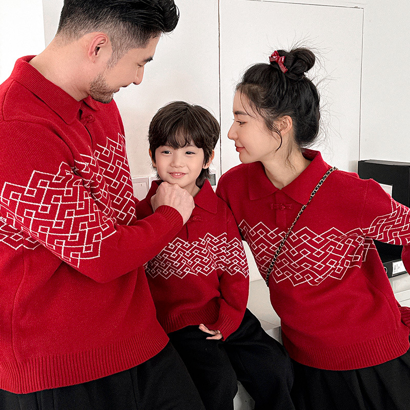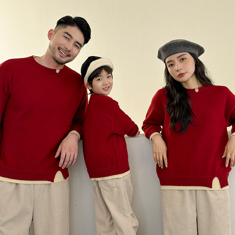 韓国版親子は冬の新型赤いプルオーバーのセーターを着ています。