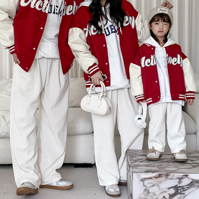 ネット赤親子服2024秋の新型韓国版児童服一枚三口四口母子コーデュロイ長ズボン