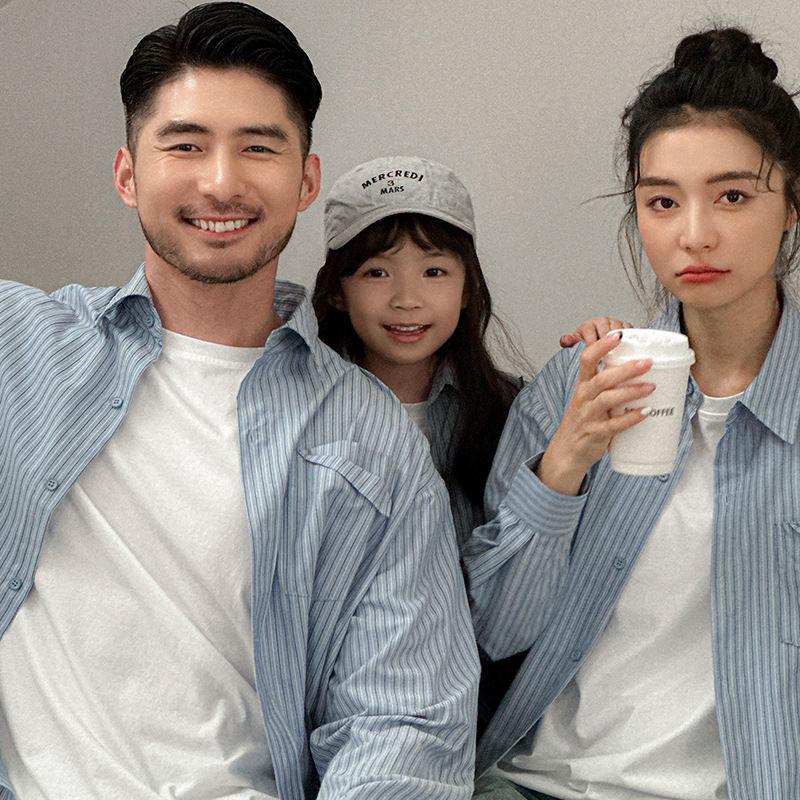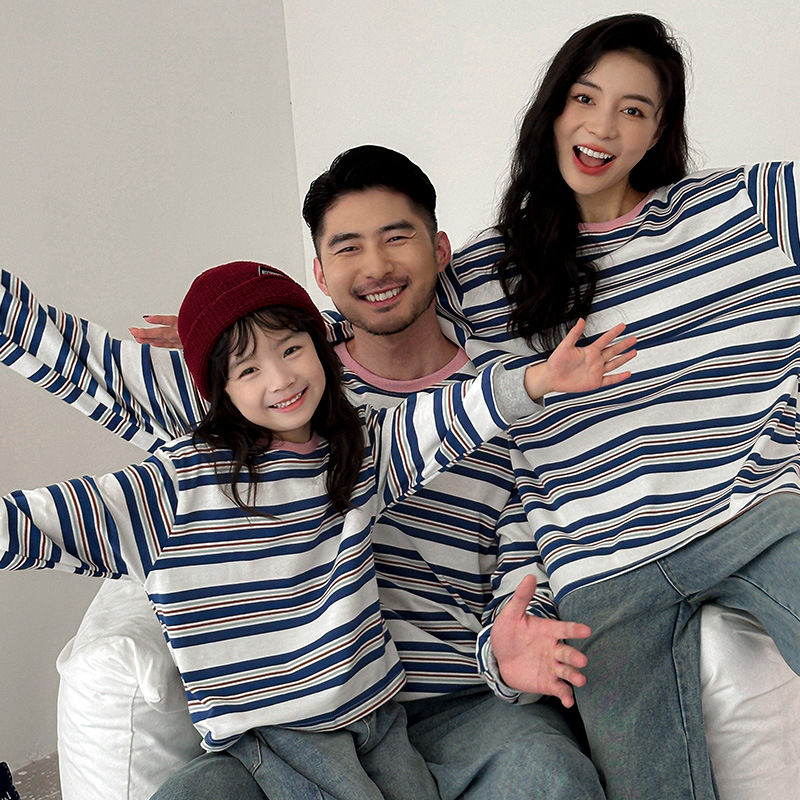親子服秋モデル一家四口男児女児ストライプシャツ母女装親子服韓国版親子卸売りブーム