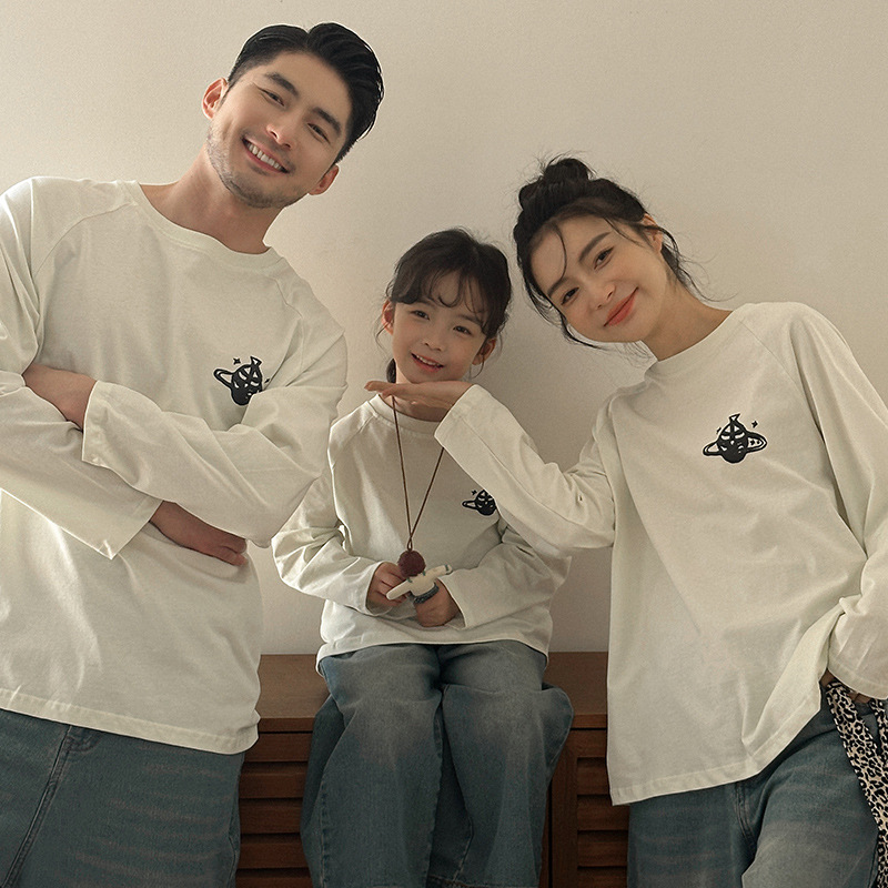 韓国版親子服春秋新作アニメカジュアルシャツ一家三口の白い上着の女性服の長袖シャツ