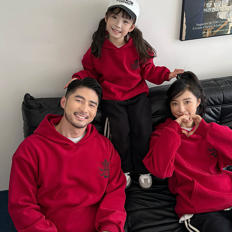 親子服冬の新型厚手保温フード付きの小童一家三口中国風赤い新年服