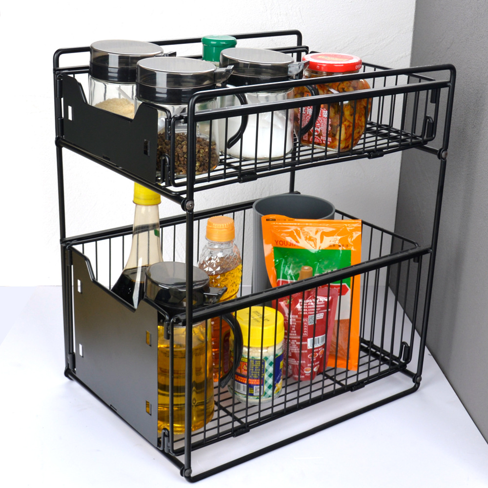 台所の台の上の物置棚の引き出し式の二重調味料棚の台所の下の水槽の物置棚の食器棚の階層的な収納棚