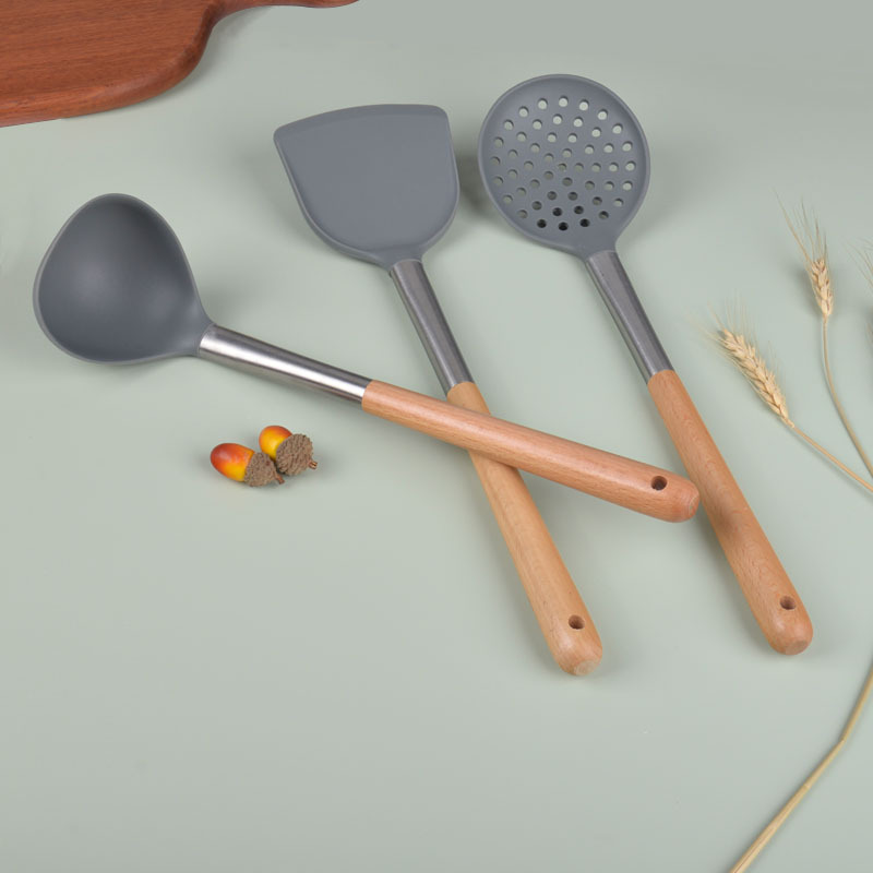 ケヤキの取っ手のシリカゲルの調理器具の3セットの長い柄のシリカゲルのスプーンは密なシャベルをすくい取って鍋の台所の調理道具にくっつかないです。