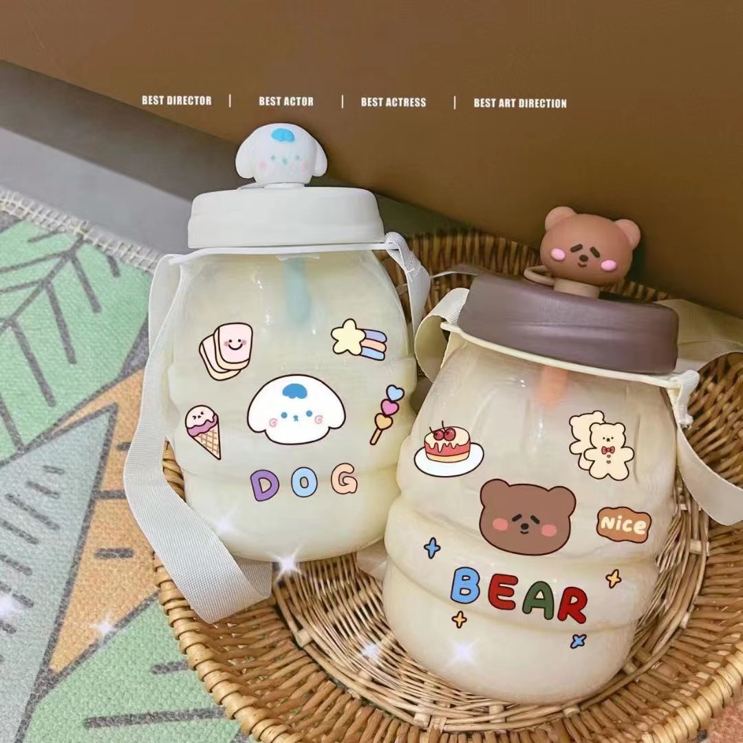 かわいい熊ストローカップ高颜値大容量プラスチックコップ女子学生児童耐熱防打カップ