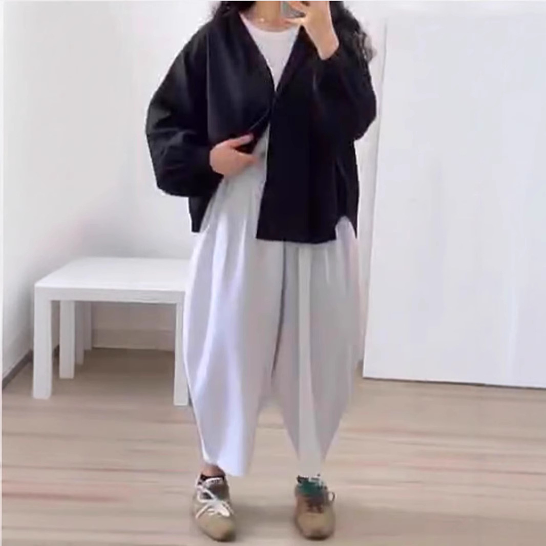 2025欧米のファッション婦人服独立駅の襟をめくって、ゆったりした長袖のしわのカーディガンの上着のズボンの2つのセットを掛けます。